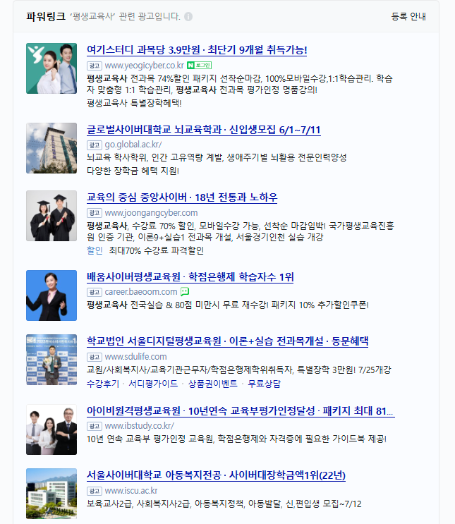 제가 등록했던 메X원격평생교육원은 안 보이네요. 저는 그냥 인지도도 있고 당시 지인이 먼저 등록 진행하고 추천받으면 등록비 할인이 있다고 해서 그냥 선택했는데, 교육원 별로 큰 차이가 나는 것 같지는 않습니다.