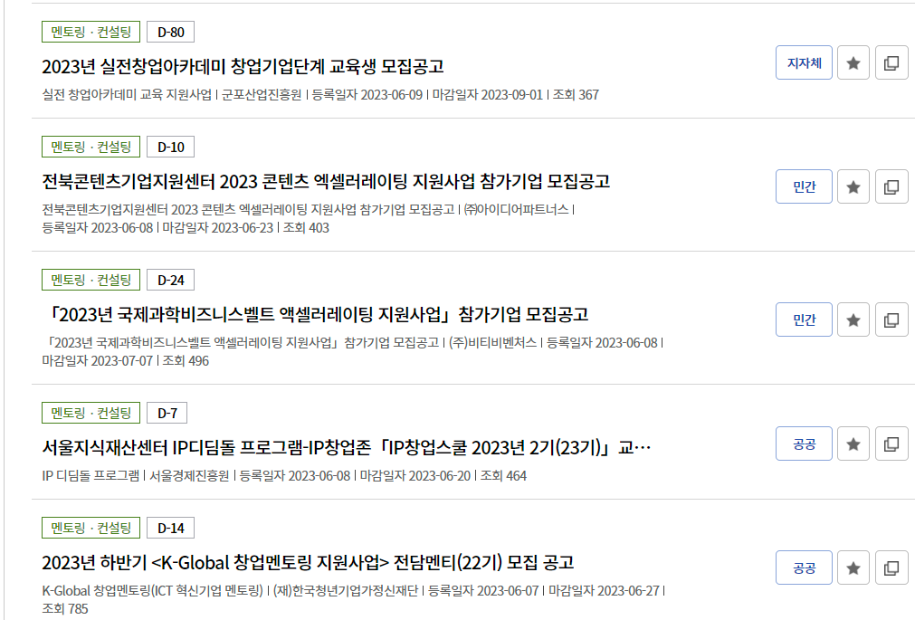 창업멘토링 지원사업이라는 명칭으로도 검색이 되고, 창업기업 교육/교육생 모집 프로그램에 대부분 멘토링은 포함이 되어있다. 또는 엑셀러레이팅 지원사업 모집공고에도 포함되어 있다. 아래에 검색 결과 이미지를 참고가능하다.
